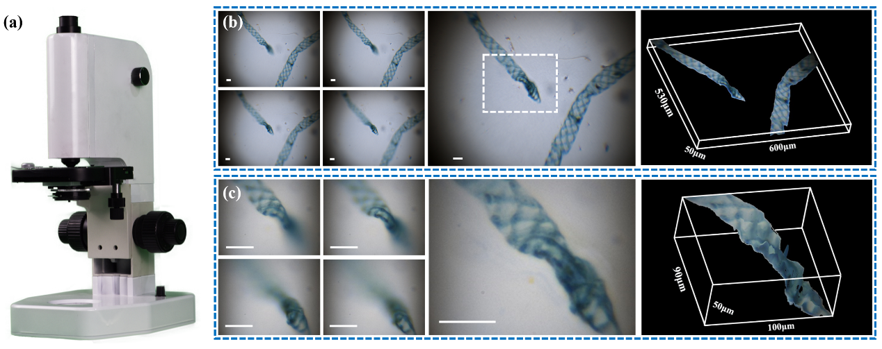 Fig.1 Prototype of the proposed microscope and the experimental results. (a) 10×-60× continuous optical zoom microscope; (b) Experimental results of depth of field expansion and 3D reconstruction of “spirogyra communis” samples with different depths at the magnification of 10×; (c) Experimental results of depth of field expansion and 3D reconstruction of “spirogyra communis” samples with different depths at the magnification of 60×.